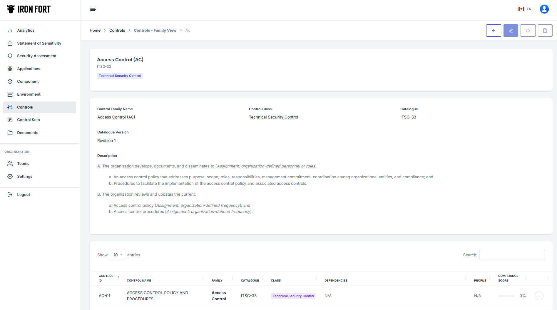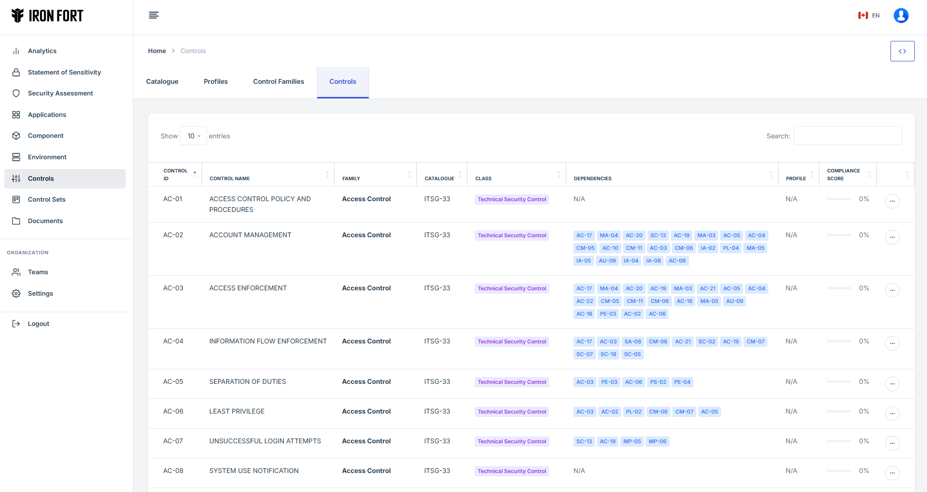 Understand how to review the security controls catalogue in Iron Fort to ensure comprehensive compliance.